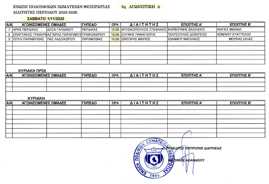 Οι διαιτητές των αγώνων του Σαββάτου 1/11/2025