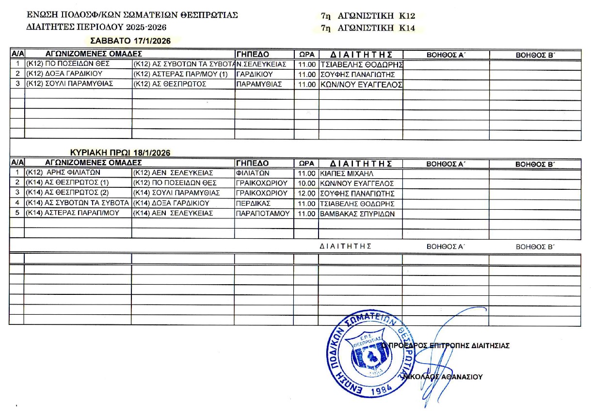 ΠΡΟΓΡΑΜΜΑ Κ-12 & Κ-14 6η αγων. (10 & 11.01.2026) - Ορθή επανάληψη