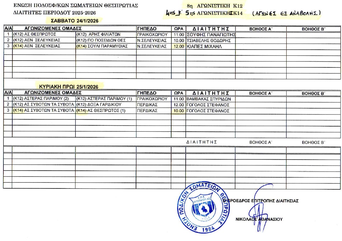 Οι Διαιτητές Α΄ Κατηγ. (13η αγων.) και Υποδομών Κ12 (8η αγων. ) & Κ14 (4η & 5η αγων.)