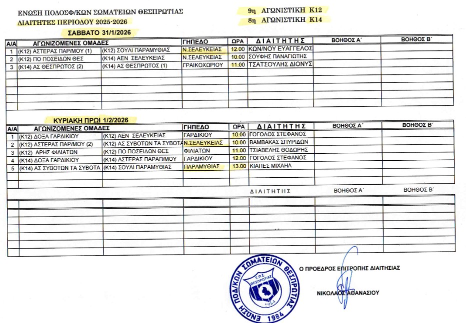 ΠΡΟΓΡΑΜΜΑ Κ-12 & Κ-14 6η αγων. (10 & 11.01.2026) - Ορθή επανάληψη