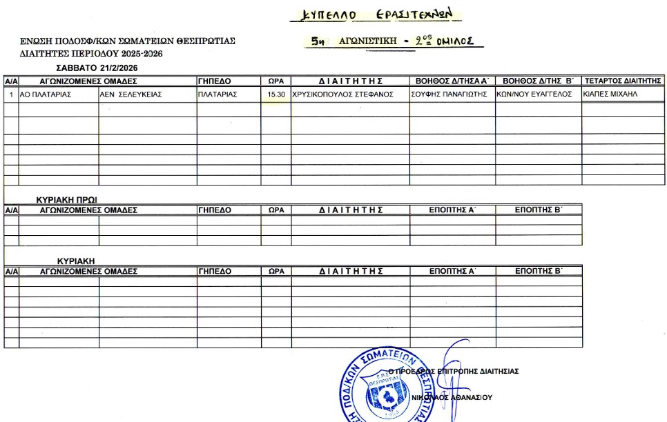 Οι Διαιτητές Α΄ Κατηγ. (13η αγων.) και Υποδομών Κ12 (8η αγων. ) & Κ14 (4η & 5η αγων.)