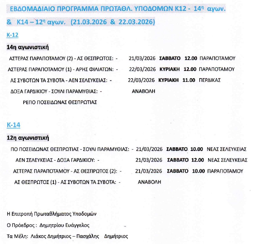 ΠΡΟΓΡΑΜΜΑ ΥΠΟΔΟΜΩΝ Κ-12 (14η αγων.) & Κ-14 (12η αγων.) 21 & 22.03.2026