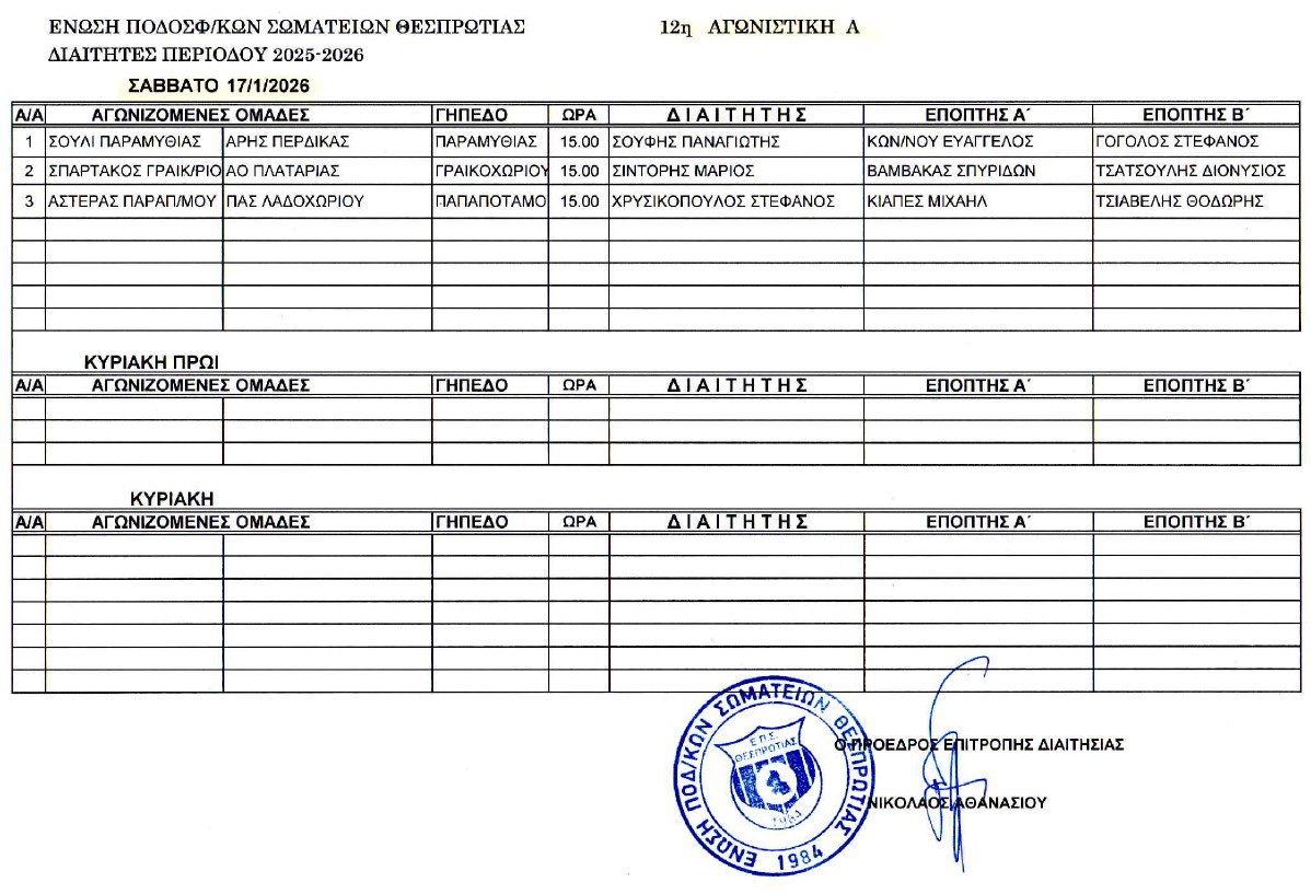 Οι Διαιτητές Α΄ Κατηγ. (12η αγων.) και Υποδομών Κ12 & Κ14 (7η αγων.)