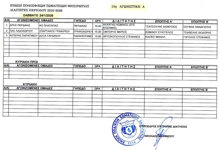 Οι Διαιτητές Α΄ Κατηγ. (13η αγων.) και Υποδομών Κ12 (8η αγων. ) & Κ14 (4η & 5η αγων.)